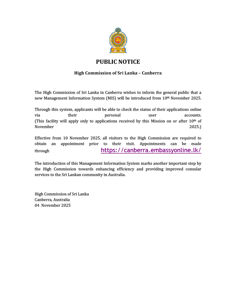 The Sri Lankan High Commission in Canberra would like to keep in touch with Sri Lankans and persons of Sri Lankan origin living in Australia, New Zealand, Fiji, Papua New Guinea, Vanuatu and other Pacific Islands as well as Sri Lankan community organisations in those countries.