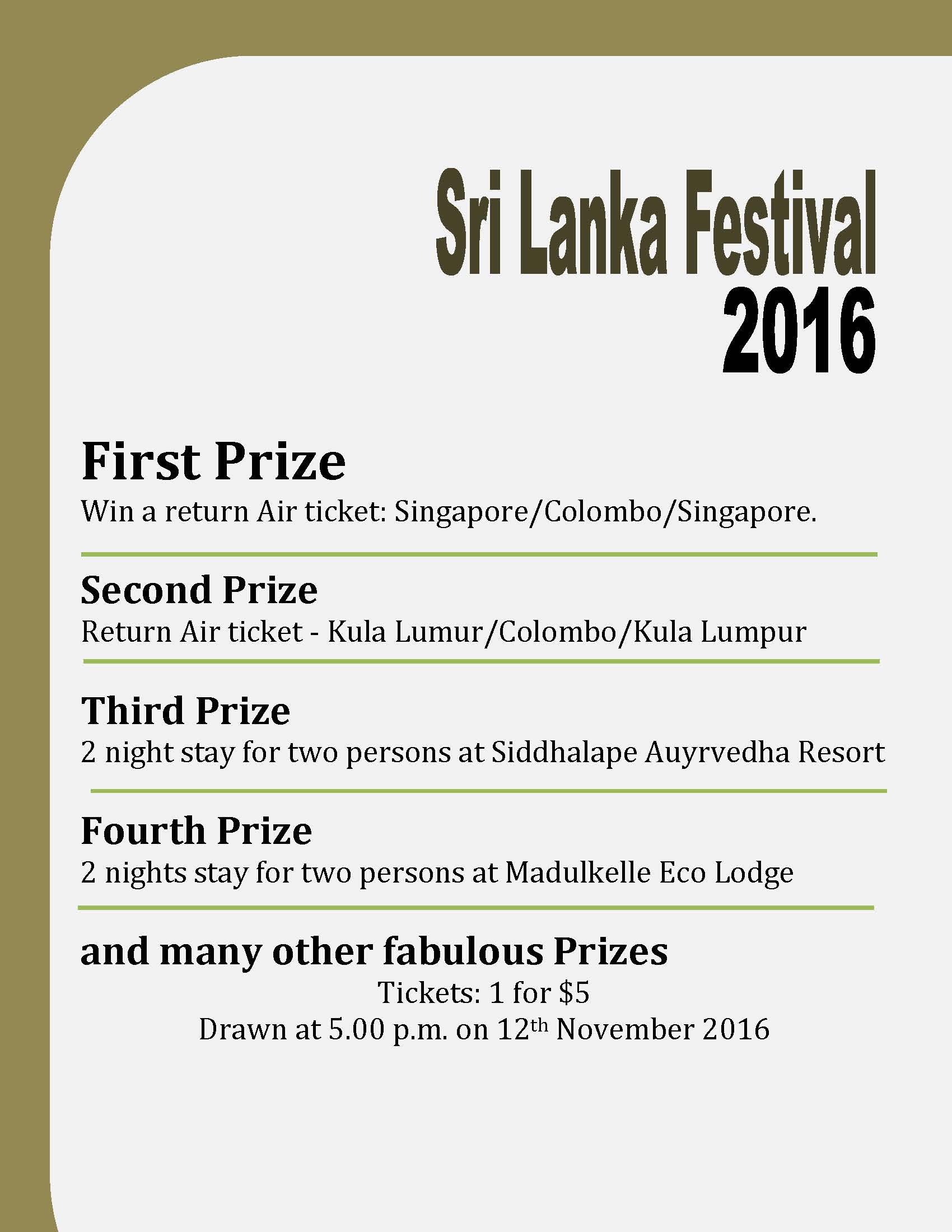 Festival highlights: – Activities for children, tourism information, astrology and a raffle draw with a chance to win a return ticket to Colombo from Singapore or Kuala Lumpur, and a two night stay for two persons at a luxurious resort in Sri Lanka.